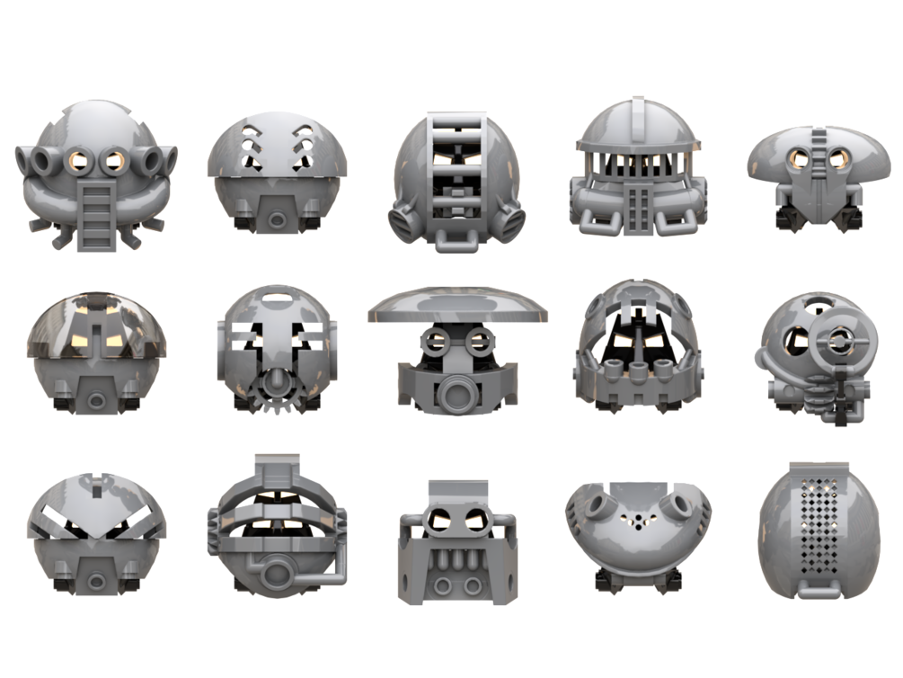 13 custom masks intended for use with the mata head in stud.io, though other heads with a stud holder may work on a case by case basis, across 21 total parts. Many include various attachment points for details and some multiple moving, swappable, or optional secondary parts such as lifting visors.